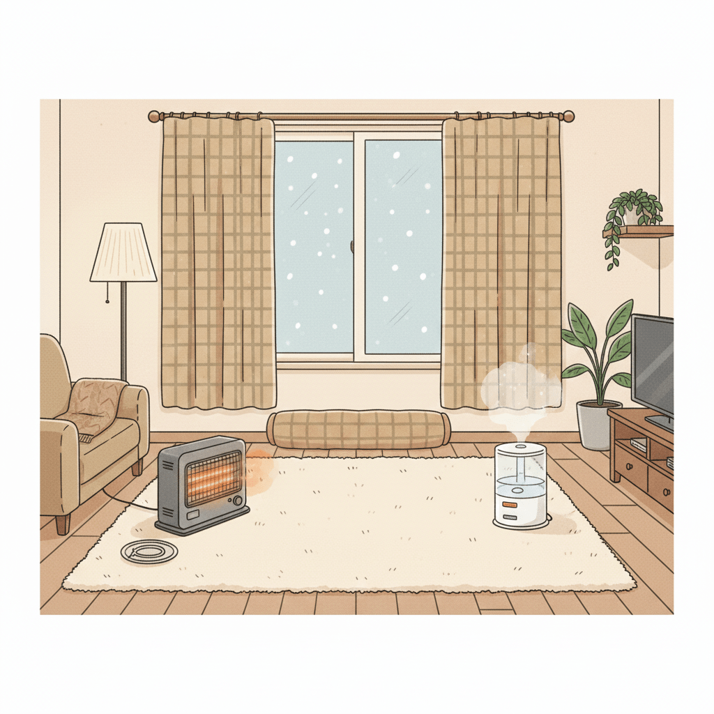 窓ガラスからの冷気や、床にたまる冷たい空気は、寒波のときに部屋を一気に冷やしてしまいます。厚手のカーテンや断熱シート、すきまテープを組み合わせて窓からの冷気を減らし、床にはラグやカーペットを敷いて冷たさを和らげるだけでも体感温度が変わります。