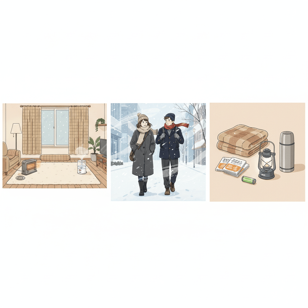 家の中では、窓と床の冷え対策、暖房と加湿のバランス、寝室の温度と寝具の見直しがポイントになります。外では、ベースレイヤーからアウターまでの重ね着と、3つの首をしっかり守ること、雪道や風の強さを想定した服装選びが、低体温症や転倒事故を防いでくれます。さらに、真冬の停電や災害時を想定して、カイロや冬用寝袋、非常用暖房などを備え、子どもや高齢者、離れて暮らす家族の様子にも気を配ることで、寒波のリスクをぐっと下げることができます。