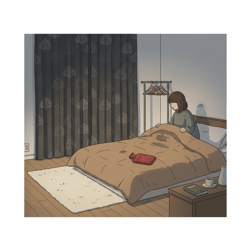 寒波が来ると、布団に入っても足先が冷えたままでなかなか眠れない…という人も多いはずです。このセクションでは、寝室全体の温度・湿度を整える方法と、ふとん・毛布・パジャマの選び方、湯たんぽや電気毛布の安全な使い方を整理します。睡眠の質が落ちると、免疫力の低下や体調不良にもつながるため、寒波のときこそ寝室の寒さ対策をしっかり見直しておきたいところです。