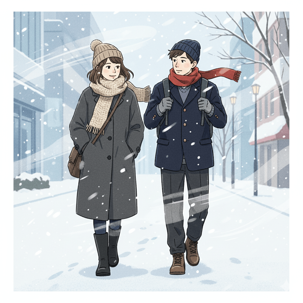 毎日同じ服装で済ませがちな平日でも、歩く時間や待ち時間が長い日、雪道を歩く日など、シーンによって寒さの感じ方は変わります。駅までの徒歩が長い人は足元の防寒を厚めに、自転車通学なら風を通さないアウターを重視、といったように、自分の動き方を前提にしたコーディネートが大切です。滑りにくい靴底のブーツや、防水スプレーで雪や雨を弾く工夫も、寒さ対策と安全の両方に役立ちます。