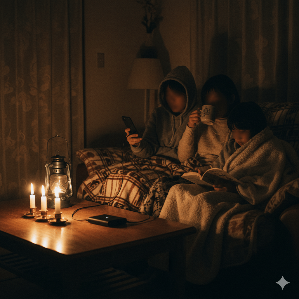 停電は「暗い」「寒い」だけでなく、情報収集と連絡手段まで落ちます。寒波襲来の対策では、暖・光・電源の3点セットを一括で整えます。