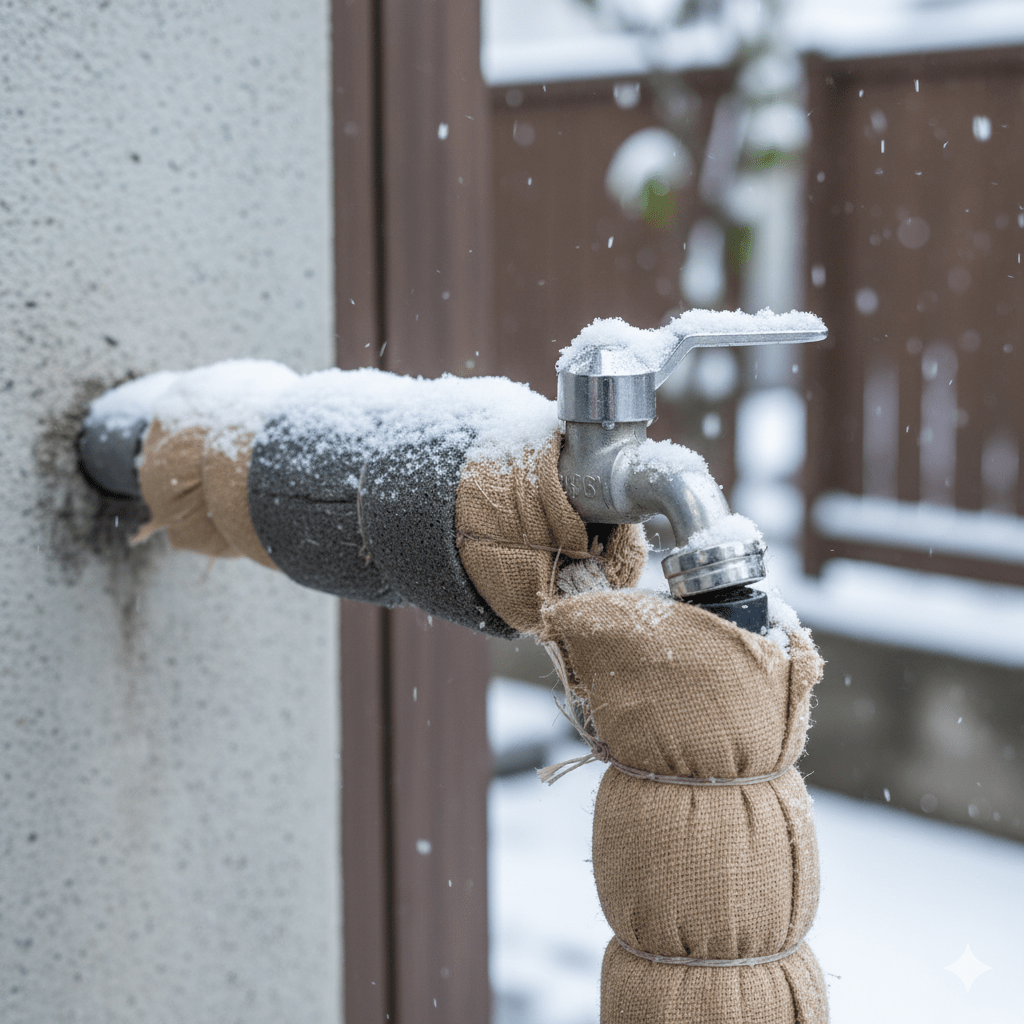 屋外の露出配管や蛇口まわりは、保温材・タオル等で覆って冷気を直接当てないのが定番です。