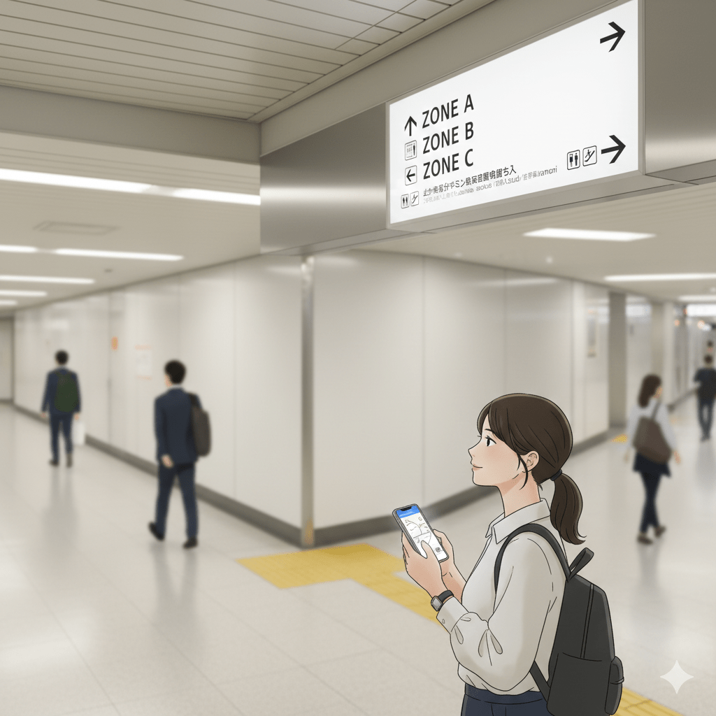 出口番号「A8」など“数字”は強い目印ですが、渋谷では数字を追いかけるほど分岐に吸い込まれがちです。先に覚えるべきは、A〜Dのエリア感(方向の大枠)です。