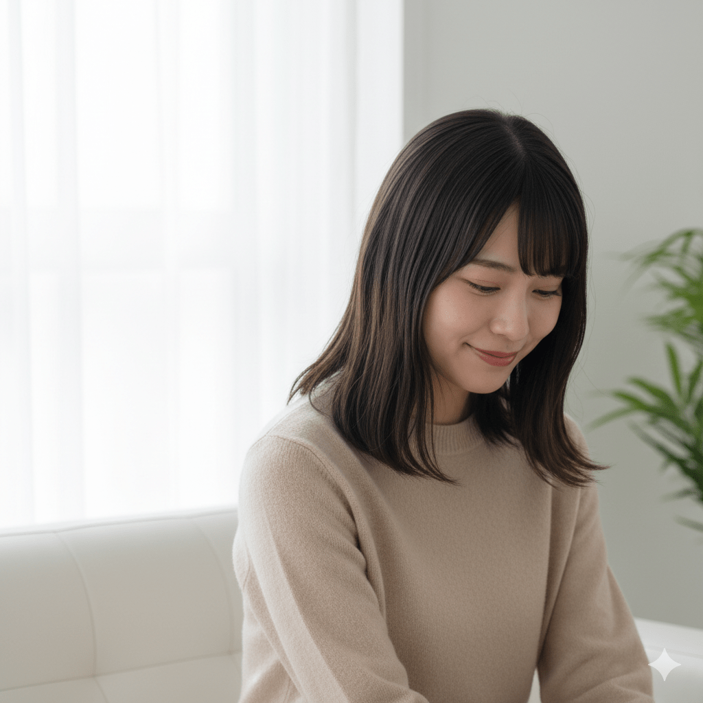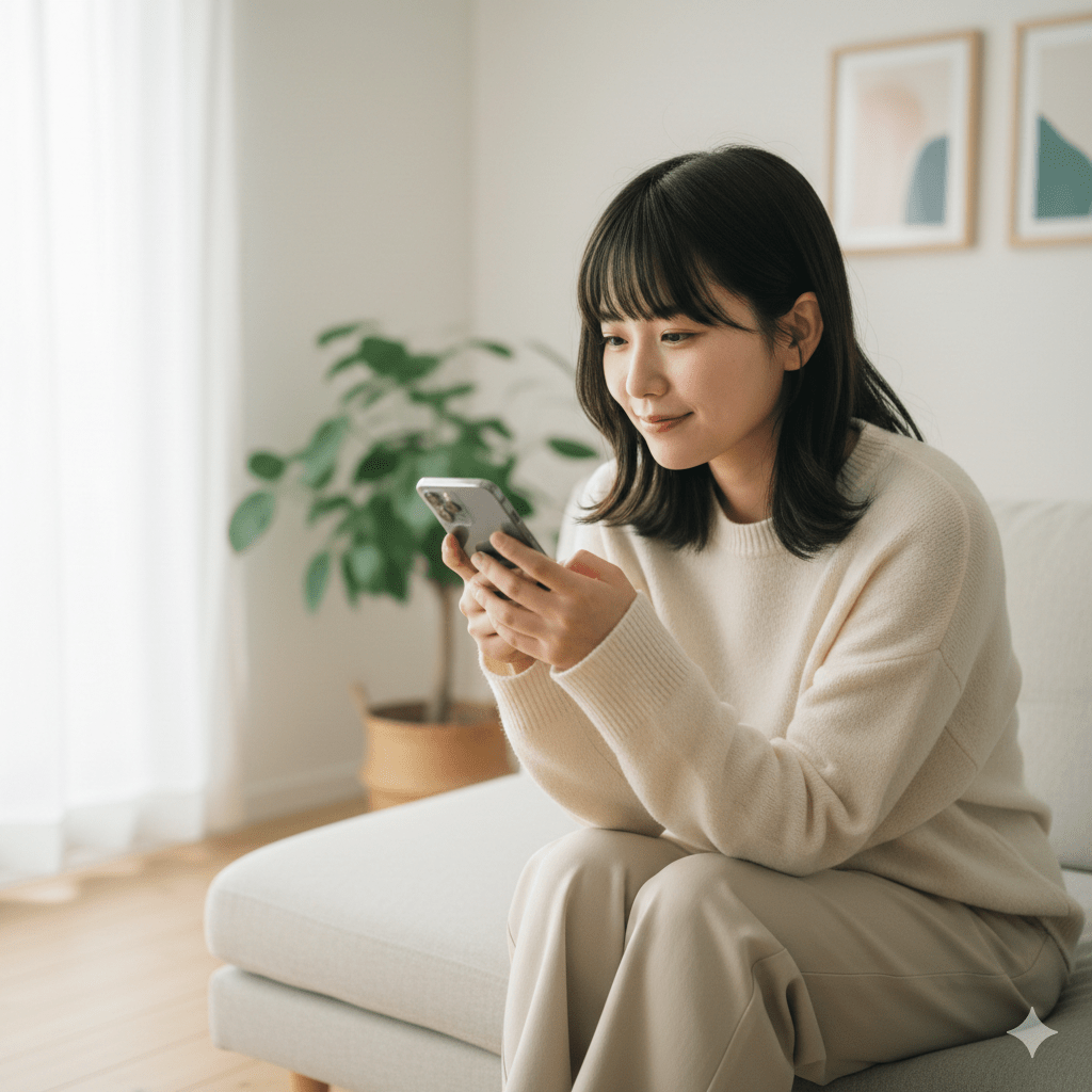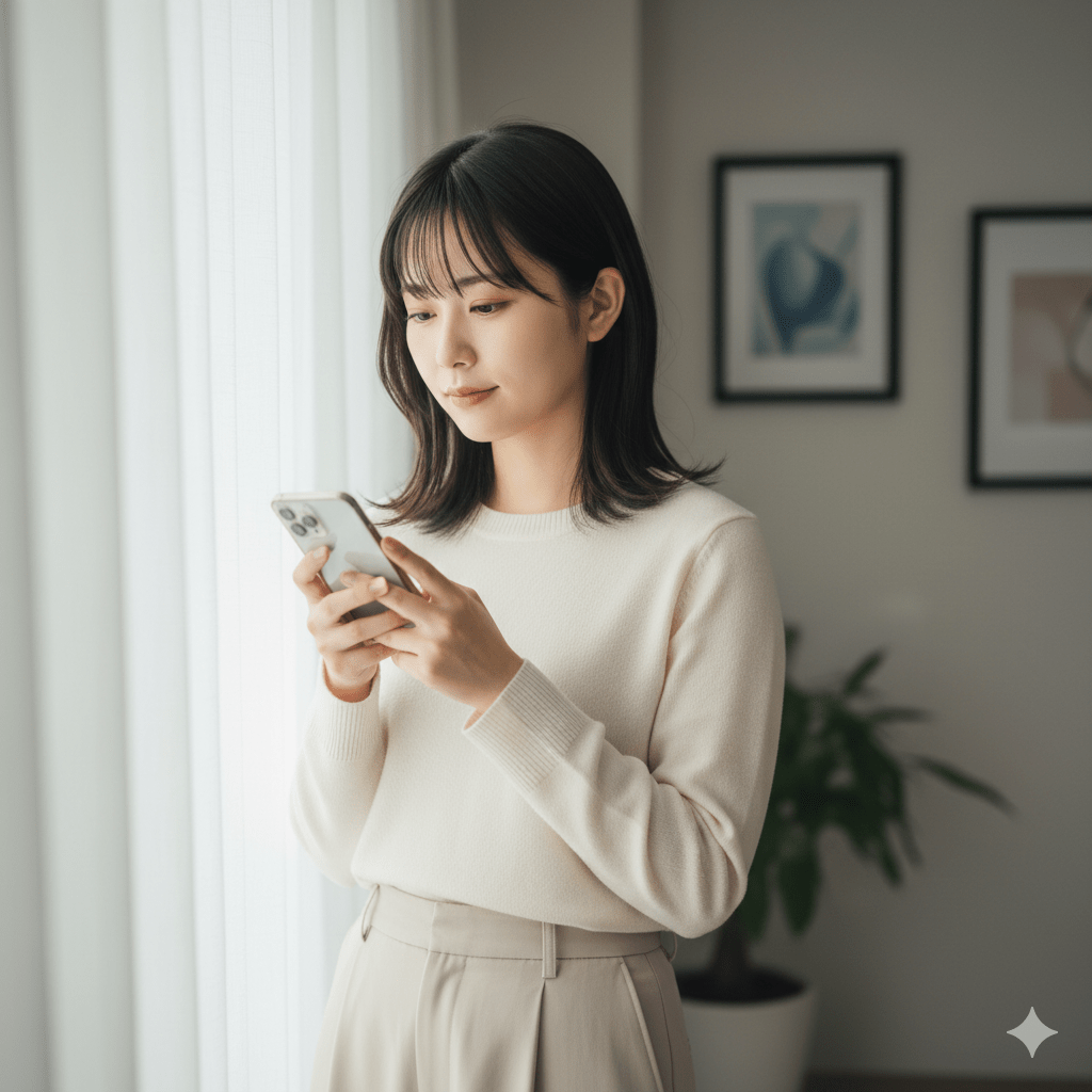 を起点に近況を追うイメージとして、スマホで投稿を確認する女性の写真風挿絵。.png)