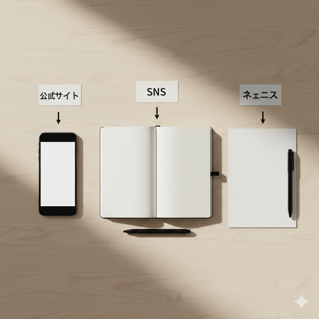| 最優先 | 公式サイト / 公式SNS | 一次情報で誤差が少ない | 近況の“核”として採用 |